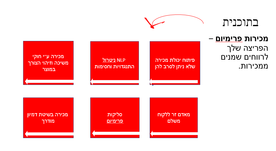 אלה הסודות שלי שלקח לי שנים להשיג וזיקקתי לך אותם: שתדע איך מוכרים פרימיום, ככה שאוטומטית הופך אותך למוכר שעושה הרבה יותר כסף ! ישר בעשירון העליון של אנשי המכירות.